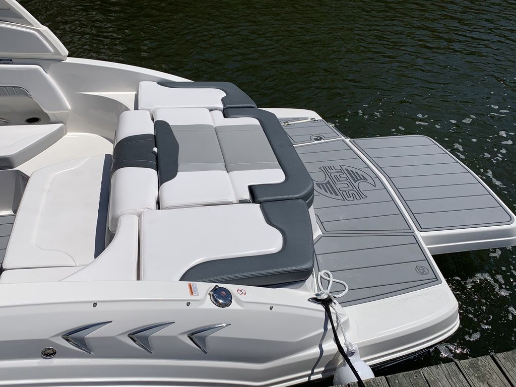 - Cockpit Layout: Two Bucket Seats (Slide and Swivel) with Logo Badging, U-Shaped Seating and Aft Hinged Sundeck with Walk-Thru, Lounge Position and Aft Facing Seat