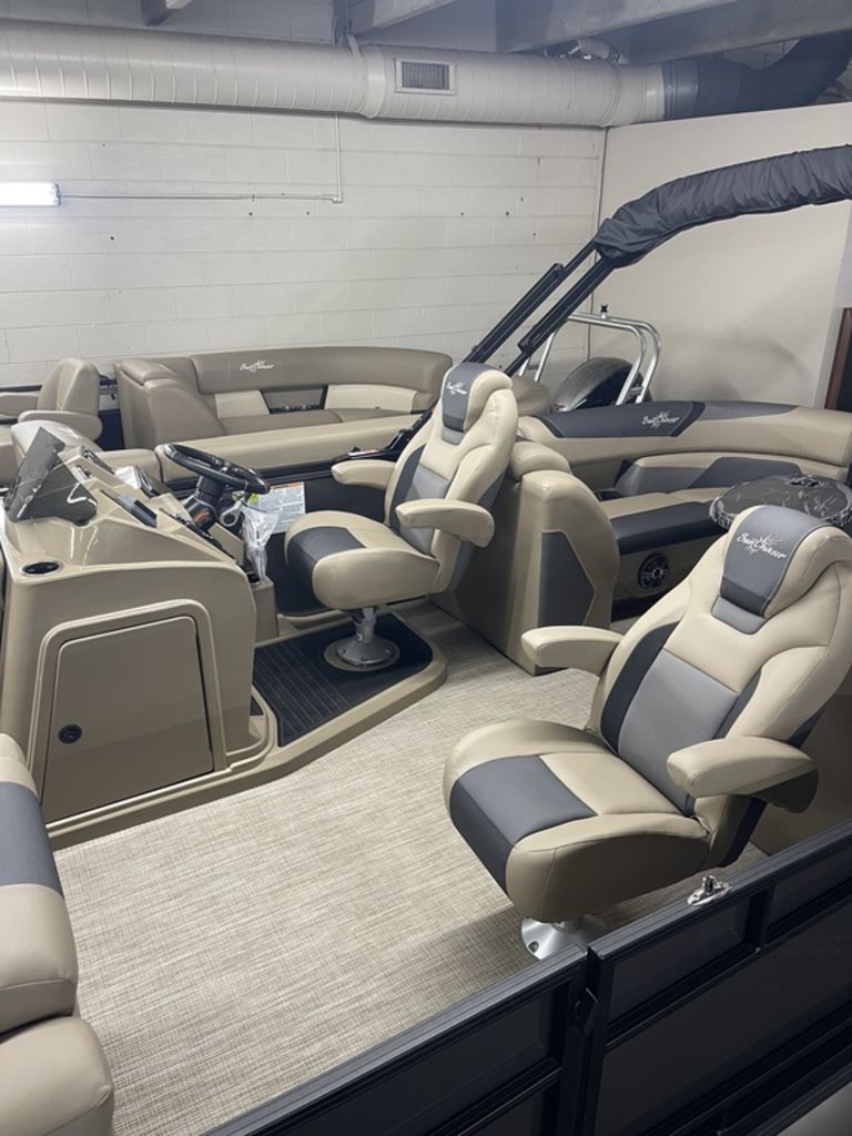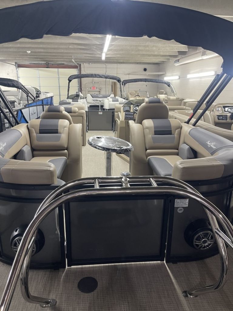 Designed for both relaxation and exhilarating performance, the SunChaser Geneva Sport 23 LR DH pontoon offers the best of both worlds. Standard features ensure an enjoyable day for everyone on board. The X-Treme PR25 Third Tube Performance Package provides a smooth ride and confident handling, whether you're cruising across the water or towing tubes for some afternoon thrills. In the rear, comfortable bench seating surrounds a built-in table, creating a perfect spot for socializing and enjoying meals with friends and family. For an added touch of luxury and control, the Geneva Sport 23 LR DH boasts both passenger and driver helm style seating. These stylish seats offer excellent visibility of both the front and rear of the pontoon. This feature-packed pontoon is perfect for creating unforgettable memories on the water, blending relaxation, performance, and a touch of luxury for your next pontoon adventure.
